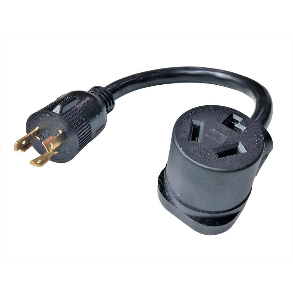 PARKWORLD brand #885859 1.5 ft. Heavy-Duty 30 Amp 250-Volt NEMA L6-30P to 10-30R Power Adapter Cord. This adapter will let you connect any appliance having a NEMA 10-30 plug, to your 3-prong Locking NEMA L6-30 wall outlet. It has a 3-Prong 30 Amp 250-Volt L6-30P male plug and a 30 Amp 250-Volt dryer 3-prong 10-30R female connector. It uses UL STW 10AWG/3C stranded wire, 100% copper conductor for heavy-duty performance, the PVC jacket ensures that cable can be used in all weather conditions.