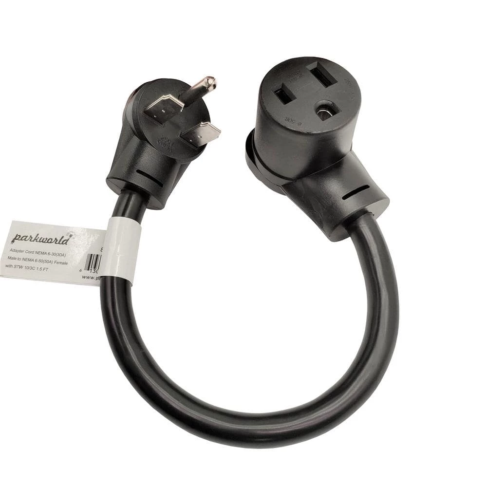 Parkworld brand, #886641 1.5 ft. 30 Amp 250-Volt NEMA 6-30P to 6-50R Welder Power Adapter Cord. This adapter cord will let you connect any devices having a 50 Amp 6-50 plug to your 30 Amp 6-30 wall outlet. It has a 3-Prong 30 Amp 250-Volt 6-30P male plug and a 50 Amp 250-Volt 6-50R female connector. It uses UL STW 10AWG/3C stranded wire, 100% copper conductor for heavy-duty performance, the PVC jacket ensures that cable can be used in all weather conditions.