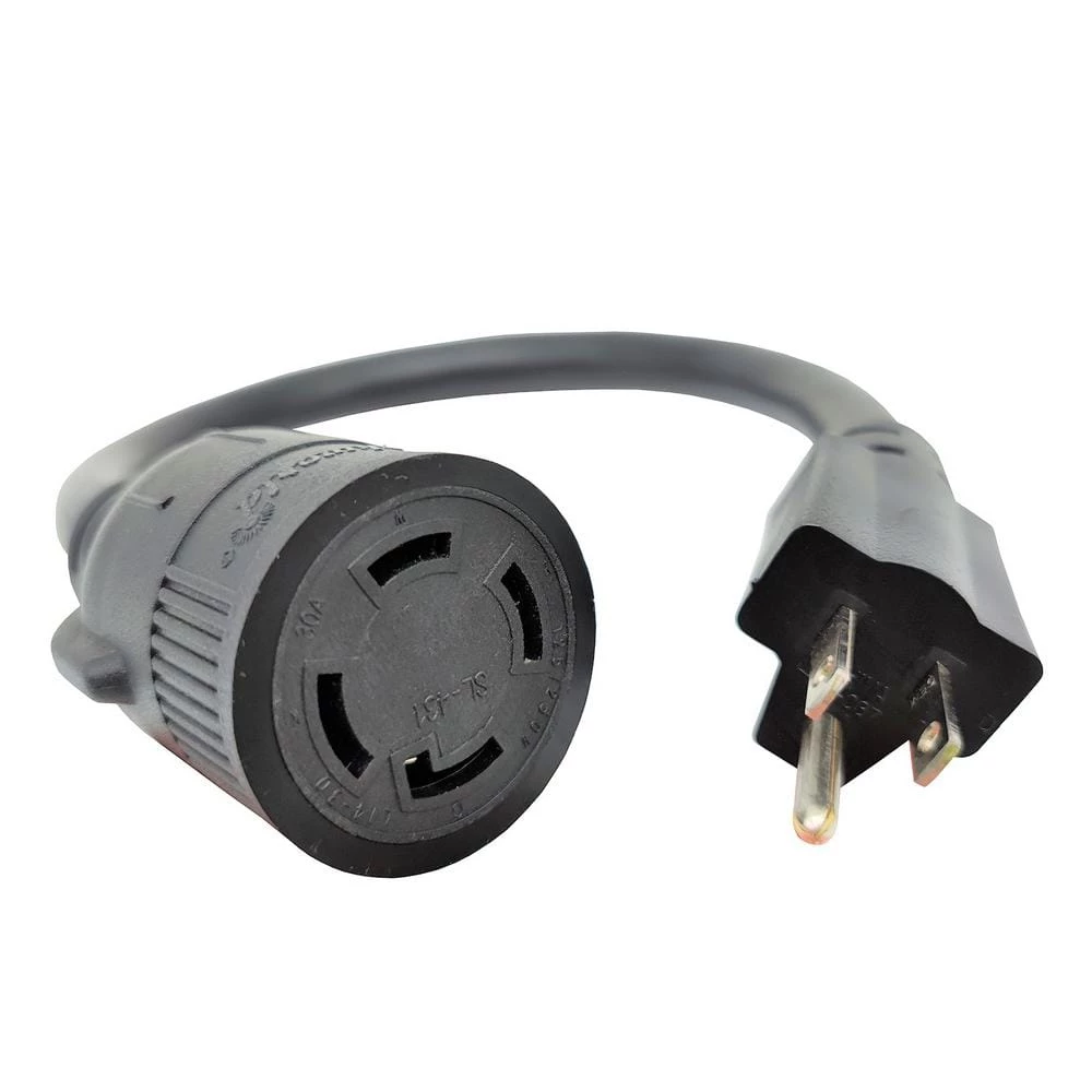 PARKWORLD brand #885477A 1.5 ft. Heavy-Duty NEMA 5-15P to L14-30R Power Adapter Cord. This adapter will let you connect any appliance having a NEMA L14-30 plug, to your regular household standard NEMA 5-15 wall outlet. It has a standard 3-Prong 15 Amp 125-Volt 5-15P male plug and a 30 Amp 125/250-Volt Generator 4-prong twist locking L14-30R female connector. It uses UL STW 10AWG/3C stranded wire, 100% copper conductor for heavy-duty performance, the PVC jacket ensures that cable can be used in all weather conditions.