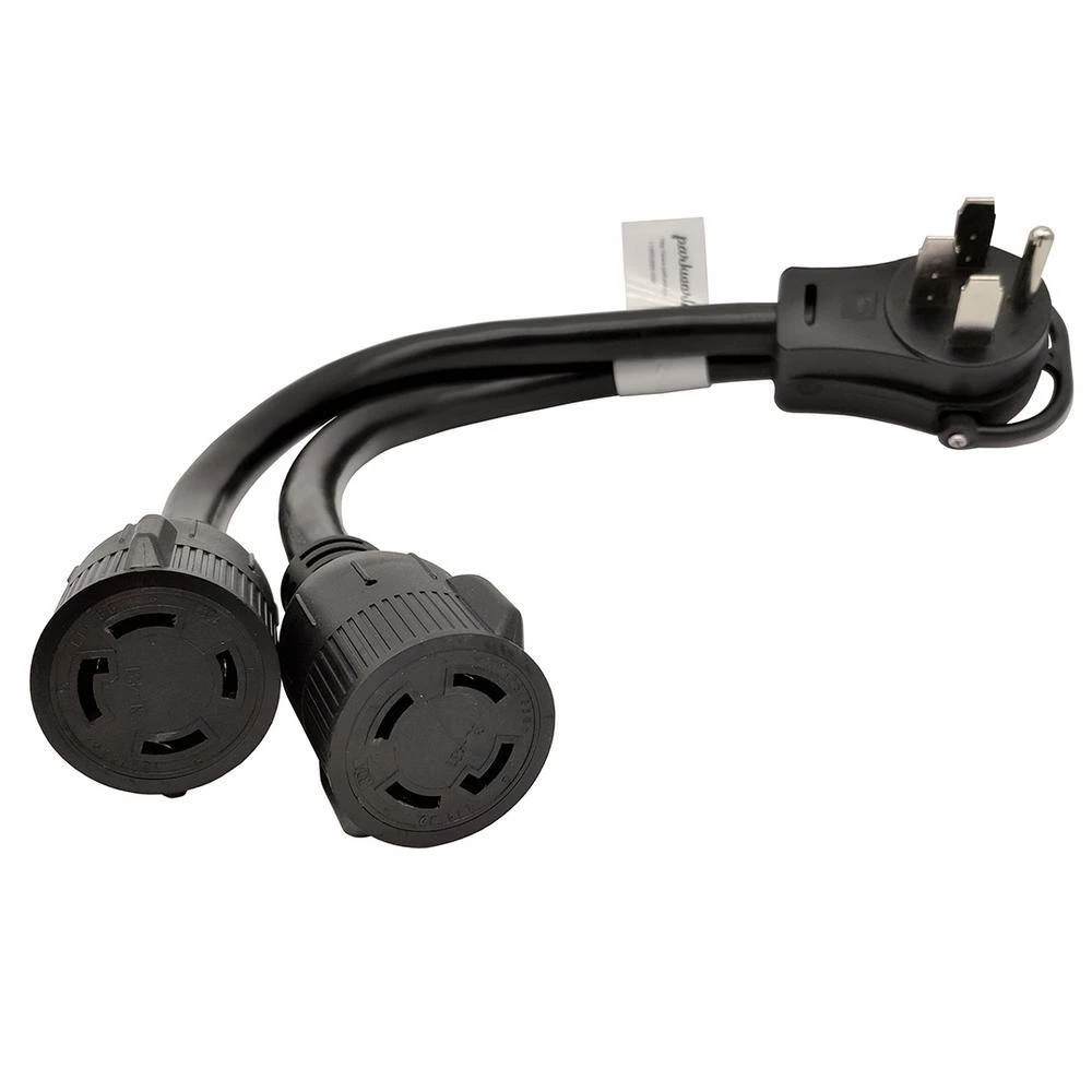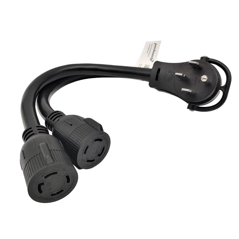 PARKWORLD brand, #61490 1.5 ft. NEMA 14-50P to 2x L14-30R V-Adapter Splitter Cord. It has a 50 Amp 125/250-Volt 4-Prong NEMA 14-50P male plug and two 30 Amp 125/250-Volt NEMA L14-30R female receptacles. It uses heavy-duty STW Jacket for weather durability. Fully molded, this V-Adapter splits a single 50 Amp 125-Volt/250-Volt power service into 2 30 Amp 125-Volt/250-Volt sockets. It gives you greater convenience and reduces wear on the electrical outlet from repeated plugging in and unplugging. CAUTION: Please make sure that the total power usage will remain below 50 Amp. It’s safest to simply avoid using both appliances at the same time.