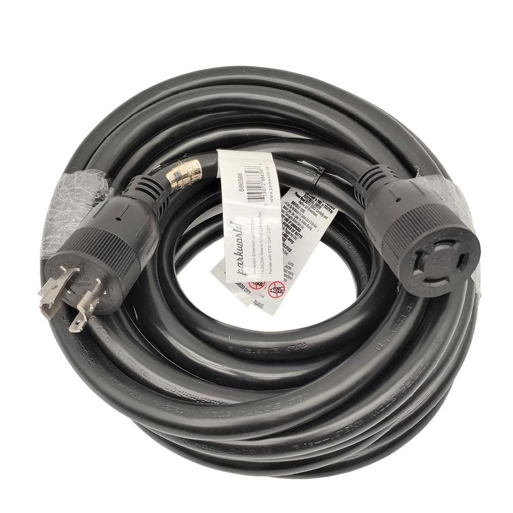 PARKWORLD brand, #886566 25 ft. Generator 20 Amp 125/250-Volt Twist Lock NEMA L14-20 Power Extension Cord, it is a durably constructed extension Cord for Generator/Industrial use. It has a 20 Amp 125/250-Volt Twist Lock NEMA L14-20P male plug and a L4-20R female connector. It used STOW 12AWG/4C stranded wire, 100% copper conductor for heavy-duty performance.