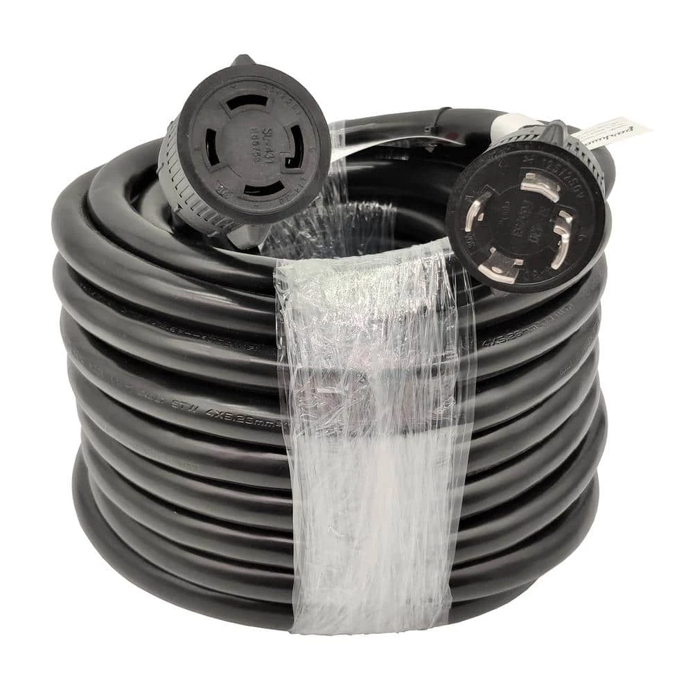 PARKWORLD brand, #692293 50 ft. Heavy-Duty 4-Prong Locking NEMA L14-30 Generator/Transfer Switch Power Extension Cord. It has a 4-Prong Locking 30 Amp 125-Volt/250-Volt L14-30P male plug and a L14-30R female connector. This extension cord is UL and cUL Listed, it will let you connect the emergency portable generators to your 30 Amp house transfer switch or power inlet box, which is great for home emergency power system applications. It uses UL STW 10 AWG/4C stranded wire, 100% copper conductor for heavy-duty performance, the STW jacket ensures that cable can be used in all weather conditions.