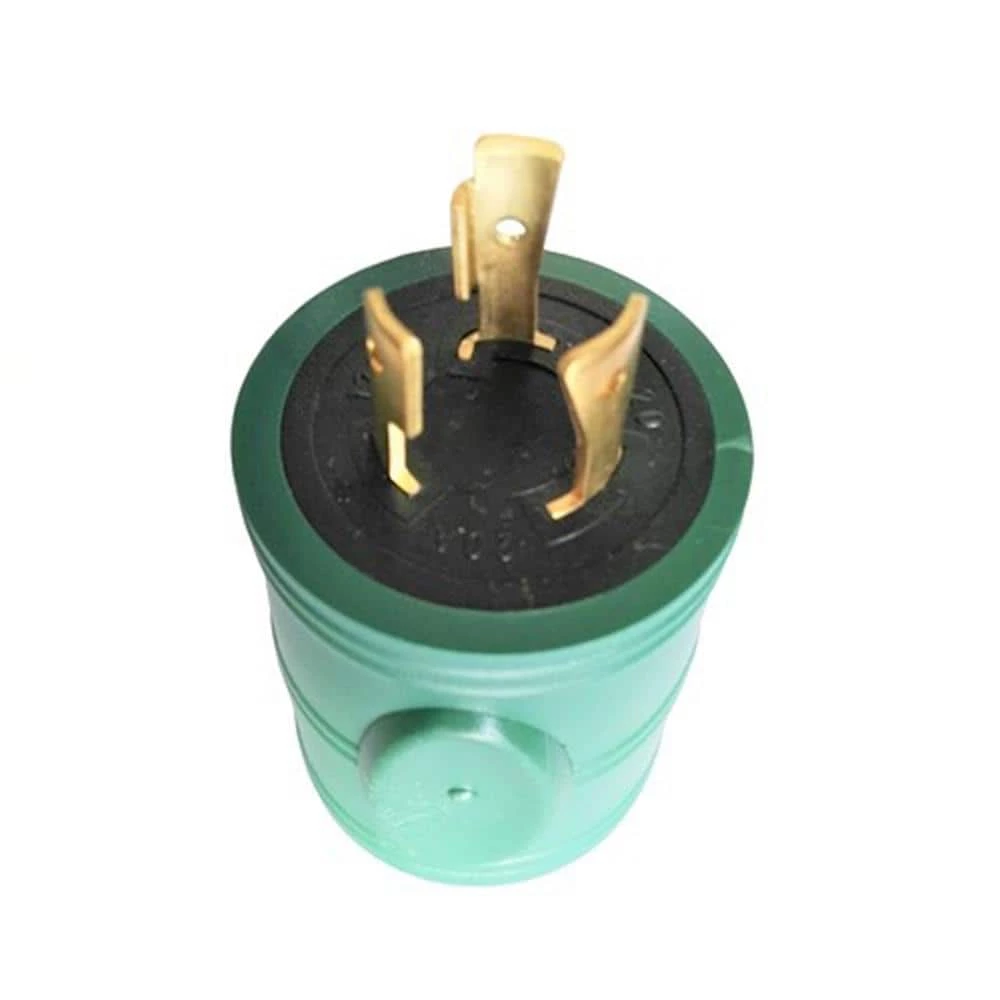 parkworld brand, #691777, Compact Locking Adapter 20 Amp 125-Volt NEMA L5-20P to TT-30R. It has a 20 Amp 125-Volt Locking 3-Prong Generator NEMA L5-20P male plug and a RV 30 Amp TT-30R female receptacle. Durable and Compact Design, fully molded allows a comfortable firm grip and easy connection.
